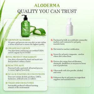 - ALODERMA products are made with natural ingredients that are suitable for all skin types including oily, sensitive, and damaged skin. Pure Aloe Vera Gel is perfect for everyday use while helping calm, nourish, and sooth skin. Satisfaction and quality are always guaranteed.
