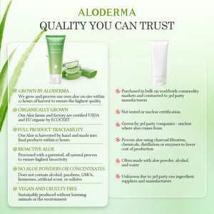 - ALODERMA Pure Aloe Vera Gel contains 99% fresh organic aloe vera. No water or freeze-dried aloe powder or concentrates are utilized.