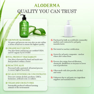 - ALODERMA Pure Aloe Vera Gel contains 99% fresh organic aloe vera. No water or freeze-dried aloe powder or concentrates are utilized.