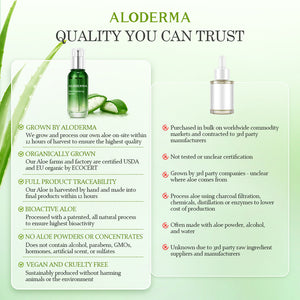 - ALODERMA products are formulated with the highest quality, organic aloe vera, grown and processed on-site at our farms within 12 hours of harvest. This ensures that our products capture the full potency and efficacy of fresh aloe vera. We use a proprietary aloe processing technology to preserve all the active nutrients of the aloe vera plant, delivering the best possible results for your skin.