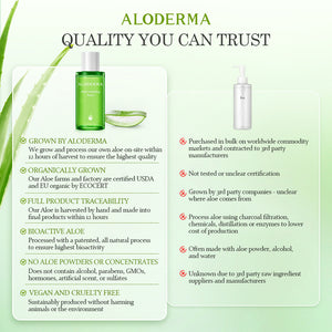 ALODERMA products are formulated with the highest quality, organic aloe vera, grown and processed on-site at our farms within 12 hours of harvest. This ensures that our products capture the full potency and efficacy of fresh aloe vera. We use a proprietary aloe processing technology to preserve all the active nutrients of the aloe vera plant, delivering the best possible results for your skin.