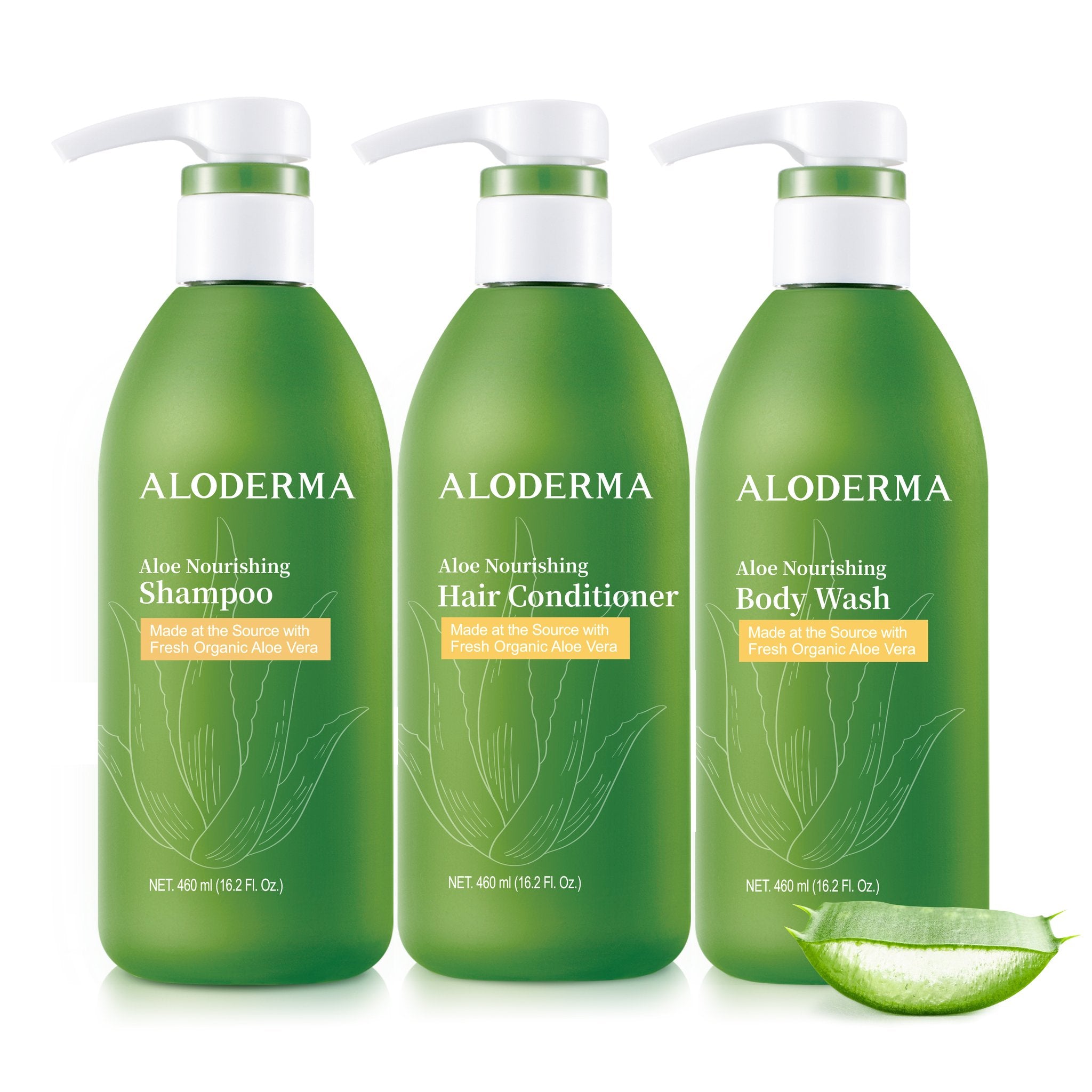 Treat yourself to the ultimate head-to-toe nourishment with the ALODERMA Nourishing Complete Care Trio, featuring the Aloe Nourishing Shampoo, Conditioner, and Body Wash. Each product is formulated with freshly harvested, organic aloe vera processed within 12 hours to preserve maximum potency. The Shampoo gently cleanses and strengthens with Crambe Seed Oil; the Conditioner deeply hydrates, detangles, and adds shine with Crambe Seed Oil and Panthenol (Pro-Vitamin B5); and the Body Wash soothes and hydrates your skin with organic aloe, shea butter, and allantoin. This nourishing set ensures your hair is soft, shiny, and manageable, and your skin is silky-smooth, refreshed, and deeply moisturized, all while adhering to a Vegan and Cruelty-free standard.
