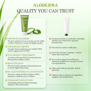 Contrairement à presque toutes les autres entreprises de soins de la peau existantes, ALODERMA cultive de manière biologique l’ingrédient principal de chaque produit que nous fabriquons : l’Aloe Vera. En contrôlant chaque élément du processus depuis le moment où l'Aloe Vera est mis en terre jusqu'au moment où il est récolté et où les produits finaux sont créés dans les 12 heures suivant la récolte, nous sommes en mesure de garantir des soins de la peau frais à l'Aloe à nos clients. Aucune autre entreprise n'est en mesure d'acheminer logistiquement l'aloès du sol jusqu'aux produits finis dans les 12 heures suivant la récolte. En utilisant un processus SATT breveté et en ayant nos installations de fabrication de soins de la peau situées sur place dans nos fermes, ALODERMA garantit que seuls des produits de la plus haute qualité parviennent à nos clients. Chaque produit ALODERMA contient entre 65 % et 99,8 % d'aloès frais biologique. Cela permet aux clients d’obtenir l’aloe vera le plus bioactif dans chacun de nos produits.