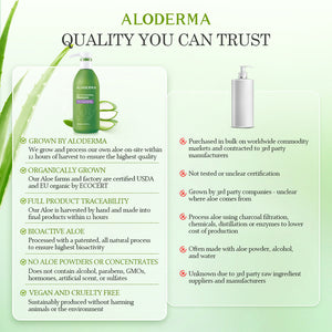 ALODERMA products are formulated with the highest quality, organic aloe vera, grown and processed on-site at our farms within 12 hours of harvest. This ensures that our products capture the full potency and efficacy of fresh aloe vera. We use a proprietary aloe processing technology to preserve all the active nutrients of the aloe vera plant, delivering the best possible results for your skin.